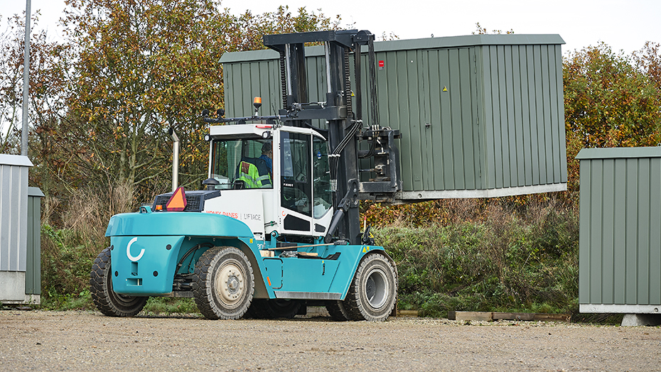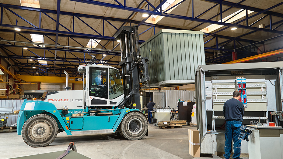 Den nya Konecranes F16-600C Liftace-gaffeltrucken speglar det strategiska fokuset på särskilt stora, färdigmonterade transformatorstationer och teknikhus. De ska transporteras ut och in genom de hårt trafikerade fabriksbyggnaderna i Vinderup, t.ex. när råhusen ska härdas under öppen himmel och de färdigmonterade husen ska placeras på väntande blockvagnar och fraktas till försörjningsföretag världen över.